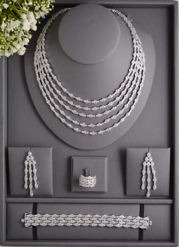 استمتعي بجاذبية لا مثيل لها مع طقم مجوهرات الزركون الفاخر متعدد الطبقات. تصميمه اللامع المزدان بأحجار متراصة يعكس الضوء بطريقة ساحرة، ليمنحك حضورًا ملكيًا في مناسباتك الخاصة.