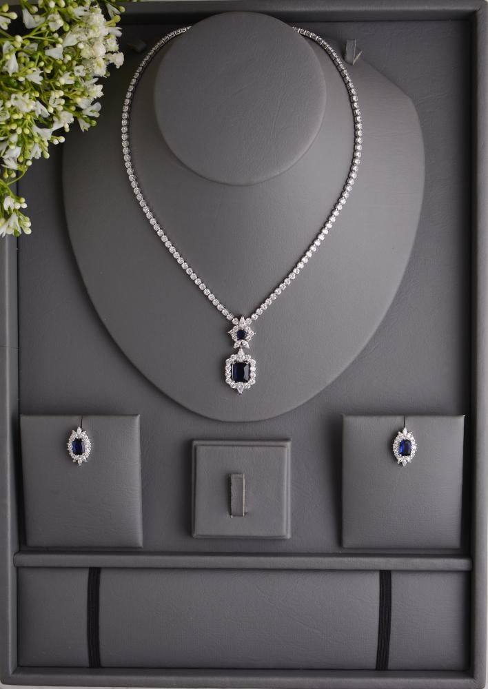 تميّزي بإطلالة فاخرة مع هذا الطقم الكلاسيكي الأنيق. الفصوص الزرقاء تضيف لمسة غموض ورقي، بينما تعكس الفصوص البيضاء المحيطة بريقًا لا يقاوم. هذا الطقم مثالي للسهرات، حفلات الزفاف، والمناسبات التي تتطلب لمسة من الفخامة الملكية.