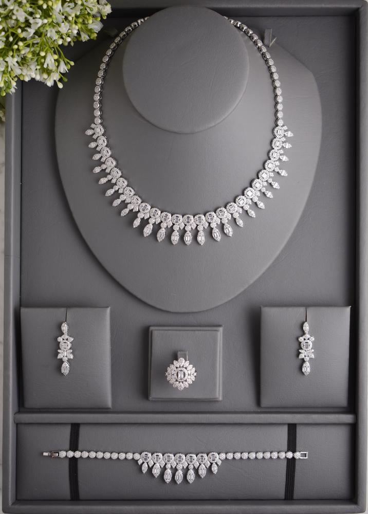 - التصميم: عقد متدرج مزين بفصوص زركون لامعة مع أقراط وسوار متناسقين.