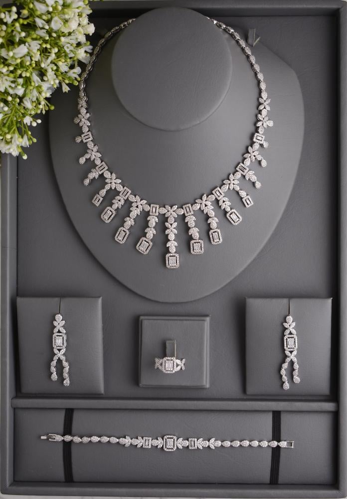 - التصميم: عقد متدلٍ مرصع بفصوص زركون مع أحجار هندسية مربعة، أقراط متناسقة، خاتم وسوار فاخر.