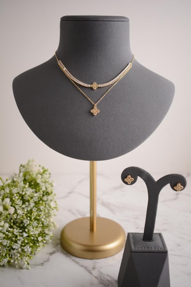 ✦ المكونات: سلسال تشوكر ذهبي بطبقتين مع تفاصيل متدلية + زوج أقراط متناسقة.